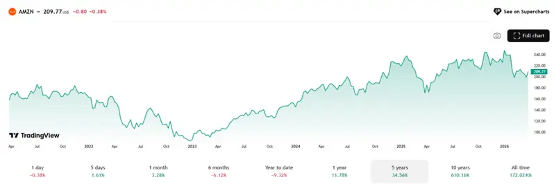 Amazon stock price prediction calls on Wall Street are getting louder right now, and J.P. Morgan just added more fuel. Analyst Doug Anmuth raised his AMZN price target to $280 from $265 and kept his buy rating, calling the stock the “best idea.” At the time of writing, Amazon trades at $209.77, down about 1.61% over the past month, with macro headwinds and rising fuel costs pushing near-term pressure on shares. The Amazon stock forecast 2026, though, tells a different story further out — one where AWS expansion and surging AI demand do most of the heavy lifting.