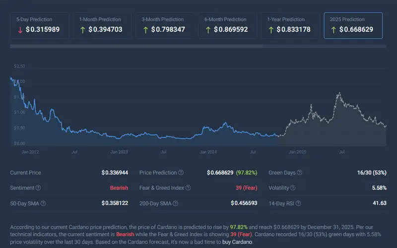 “According to our current Cardano price prediction, the price of Cardano is predicted to rise by 97.82% and reach $ 0.668629 by December 31, 2025. Per our technical indicators, the current sentiment is Bearish while the Fear & Greed Index is showing 39 (Fear). Cardano recorded 16/30 (53%) green days with 5.58% price volatility over the last 30 days. Based on the Cardano forecast, it’s now a bad time to buy Cardano.”