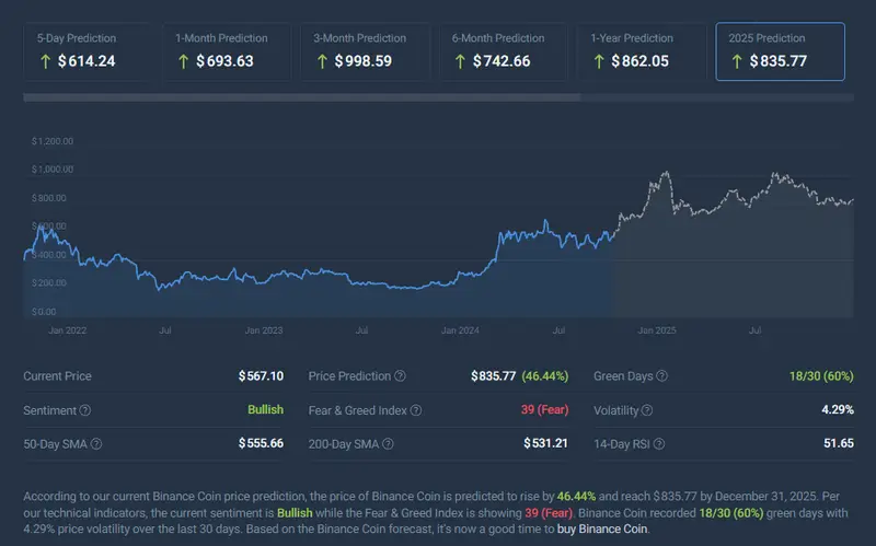 “According to our current Binance Coin price prediction, the price of Binance Coin is predicted to rise by 46.44% and reach $ 835.77 by December 31, 2025. Per our technical indicators, the current sentiment is Bullish while the Fear & Greed Index is showing 39 (Fear). Binance Coin recorded 18/30 (60%) green days with 4.29% price volatility over the last 30 days. Based on the Binance Coin forecast, it’s now a good time to buy Binance Coin.”