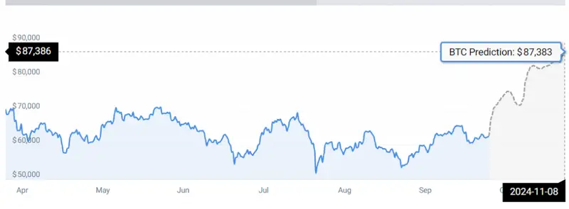 “According to our current Bitcoin price prediction, the price of Bitcoin may rise by 40.40% and reach $87,719 by November 8, 2024. Per our technical indicators, the current sentiment is bullish, while the Fear & Greed Index is showing 49 (neutral). Bitcoin recorded 17/30 (57%) green days with 4.31% price volatility over the last 30 days. Based on the Bitcoin forecast, it’s now a good time to buy Bitcoin.”