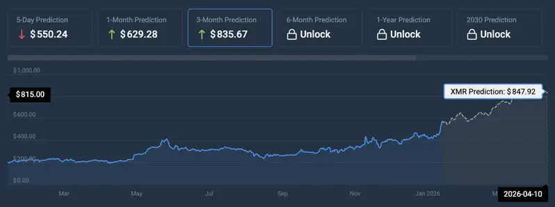 According to CoinCodex data, Monero’s (XMR) price will continue surging over the coming months. The platform anticipates the asset to hit multiple all-time highs in the first quarter of 2026. CoinCodex predicts XMR will trade at a peak of $847.92 on April 10, 2026. Hitting $847.92 from current price levels will entail a rally of about 47.8%.