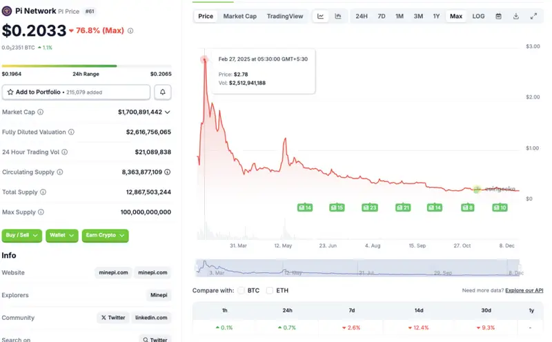 Pi Coin (Pi Network/PI) had an incredible start to the year. The coin’s price surged to an all-time high of $2.99 in February, but has since faced a massive price dip. PI’s price has fallen by more than 93% from its February peak. According to CoinGecko data, PI has rallied 0.7% in the last 24 hours, but is down 2.6% in the last week, 12.4% in the 14-day charts, and 9.3% over the previous month. In this price prediction article, let’s discuss whether Pi Coin has lost its momentum or if it can rebound from its current level.