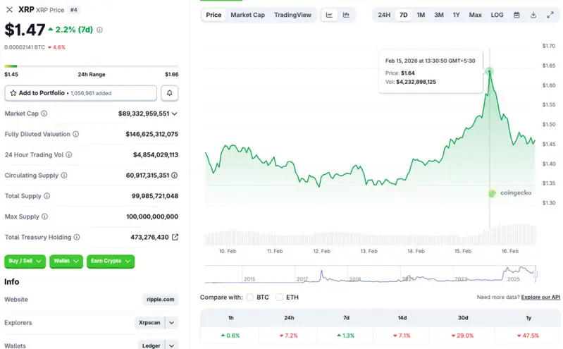 Ripple’s XRP token briefly reclaimed the $1.64 price level on Feb. 15, 2026, following a market-wide weekend resurgence. XRP’s rally came amid Bitcoin (BTC) hitting $70,000. However, the original crypto has since seen a correction back to the $68,000 price level. The larger crypto market followed BTC’s trajectory throughout the weekend rally. According to CoinGecko data, XRP’s price has fallen 7.2% in the last 24 hours, 7.1% in the 14-day charts, and 29% over the previous month. However, the asset has maintained a 1.3% rally over the last week. Let’s discuss if XRP’s price can rally past its rejection level, or will the asset face further corrections.
