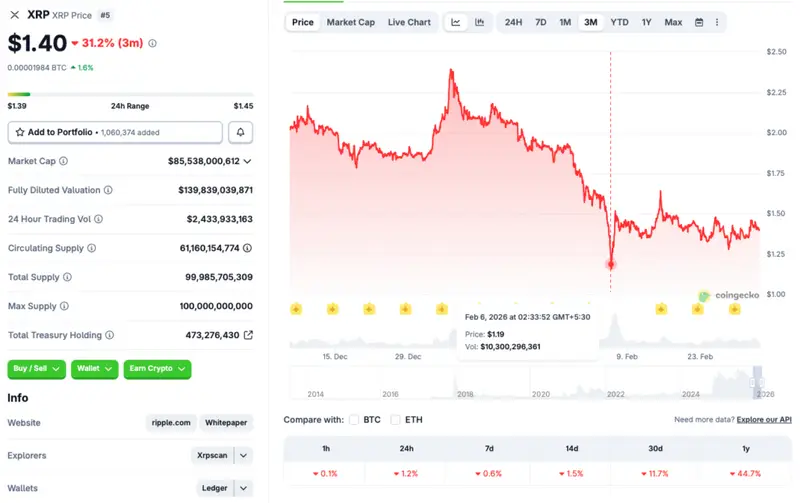 XRP’s price fell to a low of $1.19 on Feb. 6, 2026. The asset seems to have some support at the $1.15-$1.20 price range. Although the asset has faced a steep price dip since its 2025 all-time high of $3.65, it has maintained the $1 price level. According to CoinGecko’s XRP data, its price has fallen 1.2% in the last 24 hours, 0.6% in the last week, 1.5% in the 14-day charts, and 11.7% over the previous month.