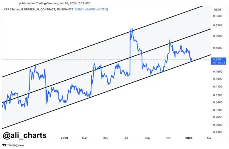 Analyst Ali shared a positive view of XRP based on charts. Since June 2022, XRP’s price has formed an ascending channel. This suggests it might go up. If this continues, XRP could reach $0.80 or even $1.10.