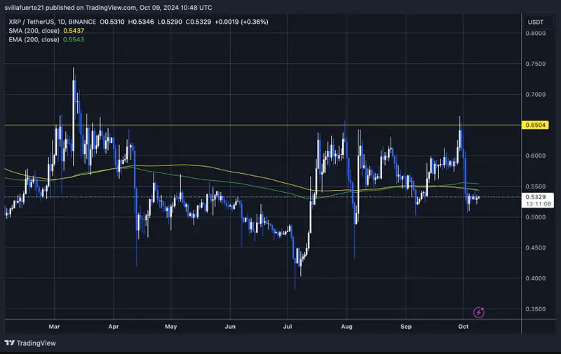 XRP trades at $0.53. It’s below two key averages: the 200-day moving average ($0.54) and the 200-day exponential moving average ($0.55). The $0.50 level is crucial. If XRP drops below it, selling might increase. But if it goes above the averages, it could signal a positive shift.